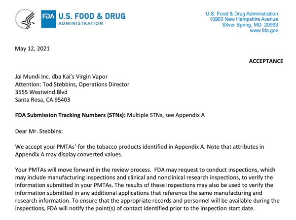 After over eight months of anxiously waiting to hear back after submitting our PMTA applications, we finally received a letter from the FDA letting us know that our applications have been officially accepted and that we will be moving on to the review phase!