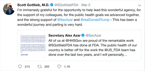 Commissioner, Scott Gottlieb suddenly and unexpectedly resigned on March 5th.