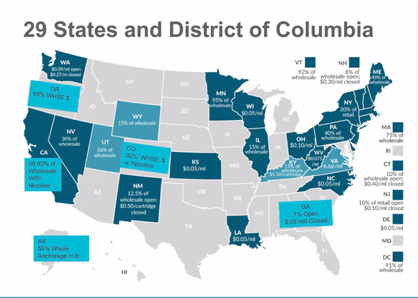 You’ll also notice that every state has a different metric by which they tax vaping.  Some states charge a percentage based on the wholesale price, others, such as New York, tax based on the retail price (20% tax on the retail price in New York!). Some states charge per milliliter of vape juice or by cartridge, some states tax zero nicotine vape liquids while others exempt nicotine-free products and only charge tax on e-juice that contains nicotine.